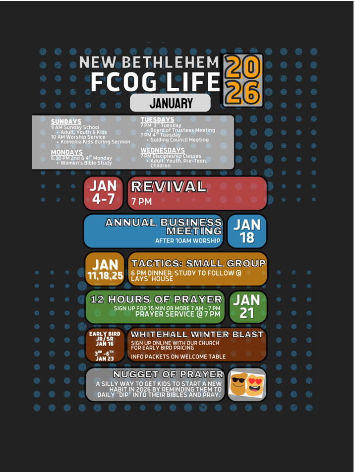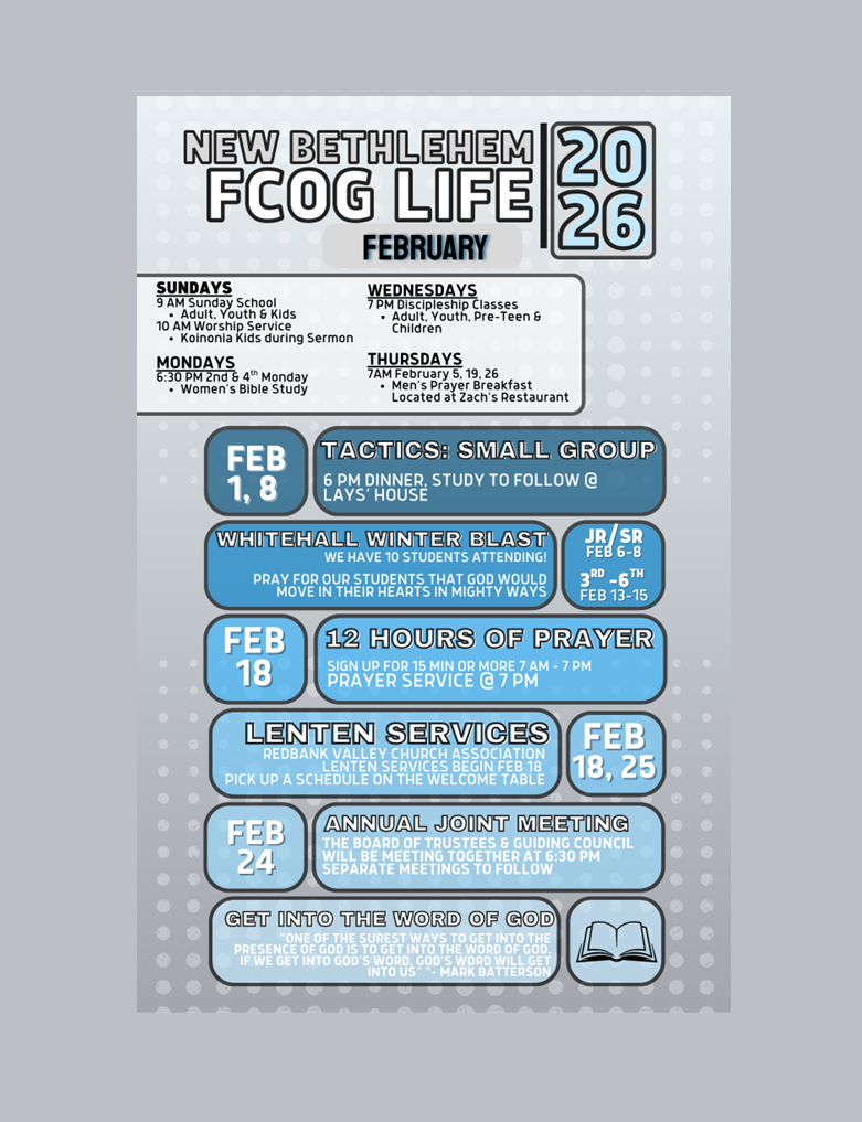 Here is a quick snap shot of what we are up to during the month! More information on each topic will be given during Sunday Morning Worship Services.