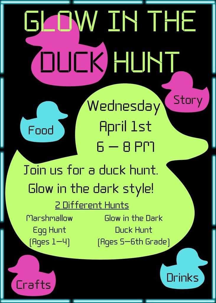 Wednesday April 1st from 6-8 PM join us for a duck hunt, glow in the dark style! A Marshmallow hunt will be for ages 1-4 and the Glow in the Dark DUCK hunt will be for ages 5—6th Grade. Food, drinks, crafts and a Bible story will be shared!
